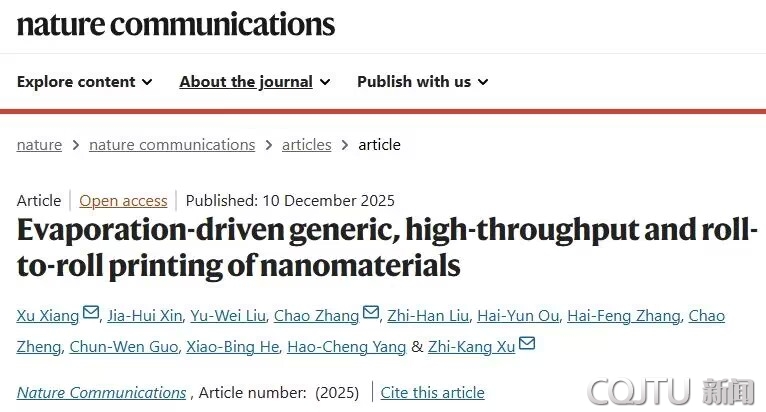 Recently, the groundbreaking research of Dr. Xu Xiang’s team from the Materials Science and Engineering School at Chongqing Jiaotong University has been officially published in the top-tier international journal Nature Communications, under the title “Evaporation-Driven Generic, High-Throughput and Roll-to-Roll Printing of Nanomaterials.” The study proposes a novel generic, high-throughput, evaporation-driven roll-to-roll printing method for nanomaterials, successfully addressing the long-standing industrial challenge of scalable micro and nanomaterial fabrication, thereby injecting strong momentum into technological innovation and industrial applications in related fields.